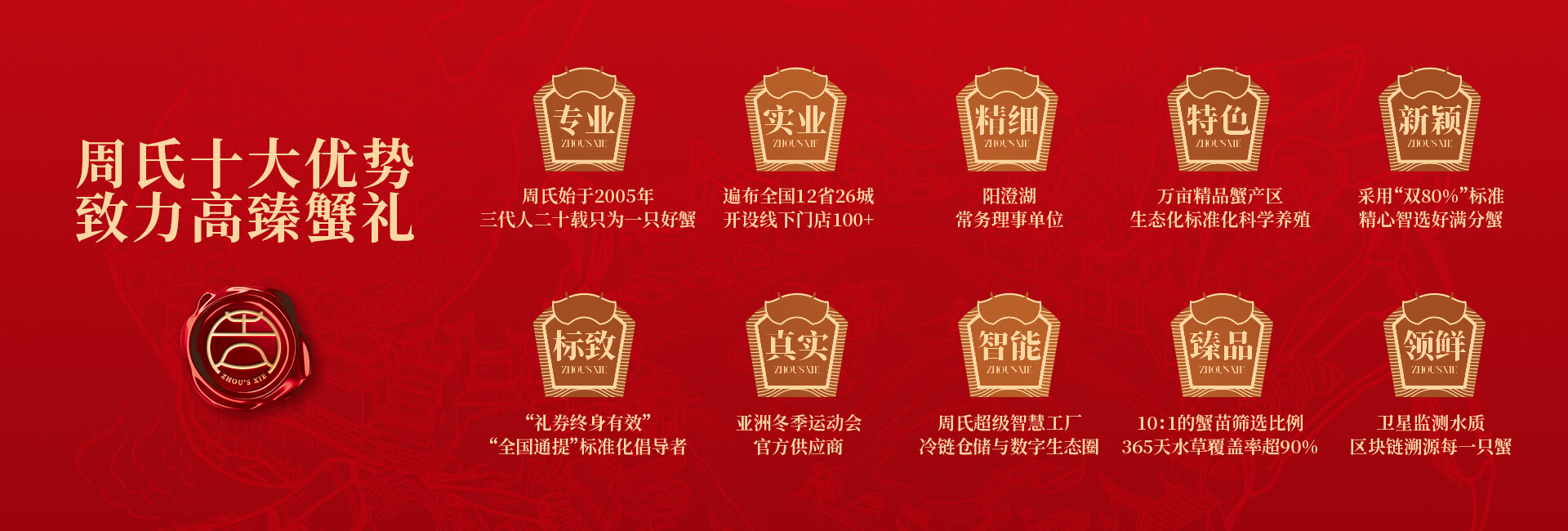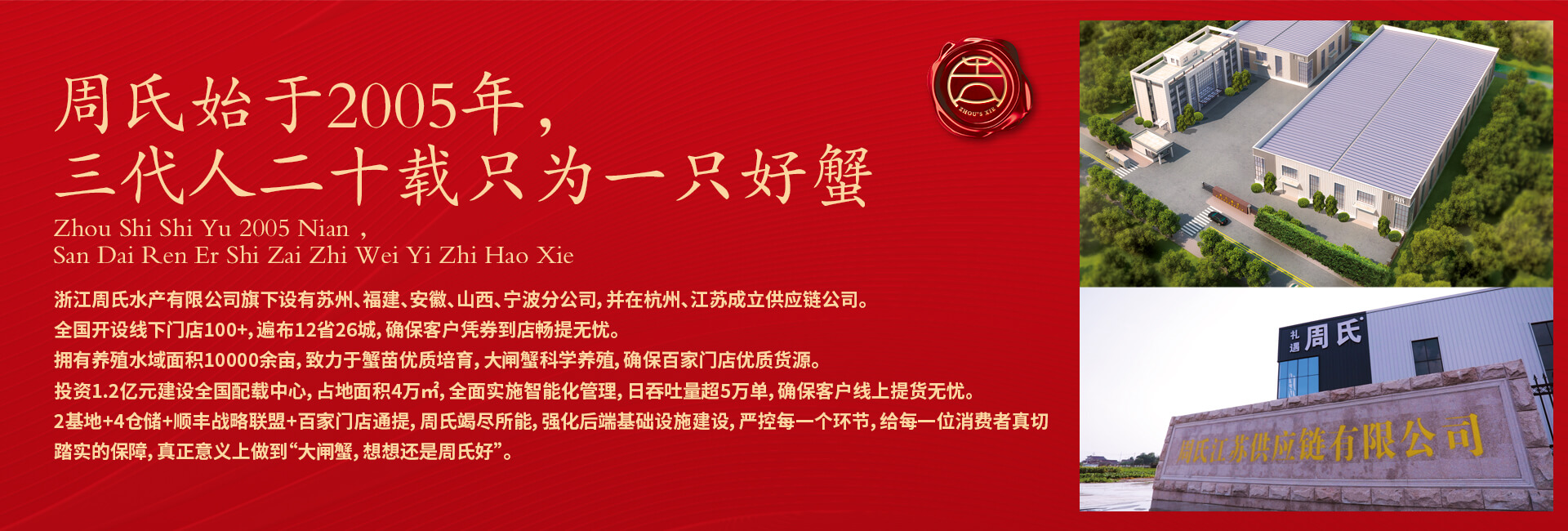 周氏水產(chǎn)精品大閘蟹,14年匠心沉淀,全國(guó)87家直營(yíng)門(mén)店,100只大閘蟹只精選最優(yōu)50只。不虛標(biāo)規(guī)格,不玩???